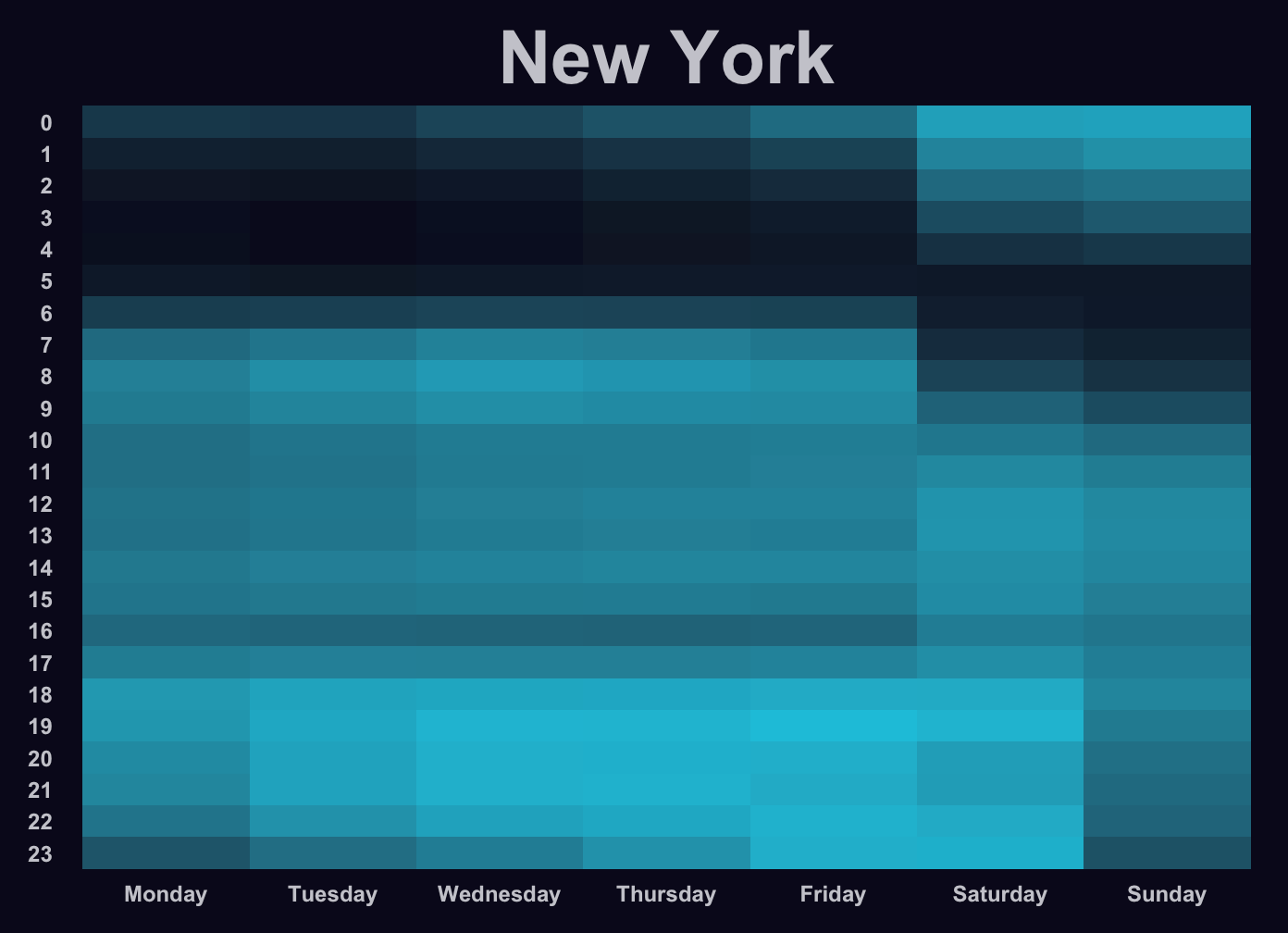 The latest use case I’ve come across is a visual comparison of Uber usage in different cities created by Uber’s engineering team. You can find their graphics and the accompanying article on their blog. Each of their graphics shows the amount of Uber trips depending on weekday and hour. The number of trips is compared within weekdays with high levels of usage displayed in a bright blue color.