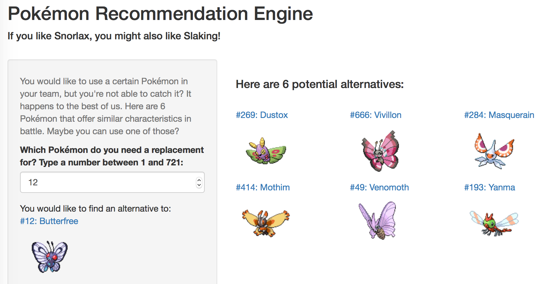 Here is where the Pokémon Recommendation Engine comes in. Just like Amazon recommends you similar products when you’re visiting a product page, and similar to how Spotify can recommend you music you’d might like, the Pokémon Recommendation Engine will suggest you good alternatives to a given Pokémon.