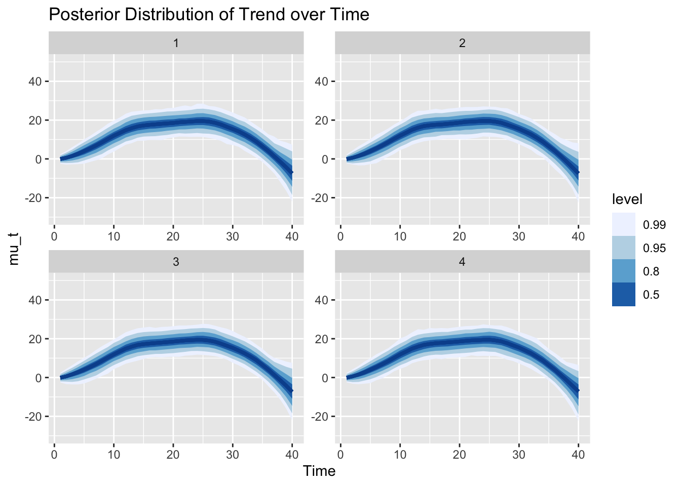 In just the same way, we can also visualize the posterior distribution of the trend \(\mu_t\) over time. The trend increases as the slope above has positive values, then becomes constant as the slope hovers around 0, and changes to decreasing as the slope drops below 0.