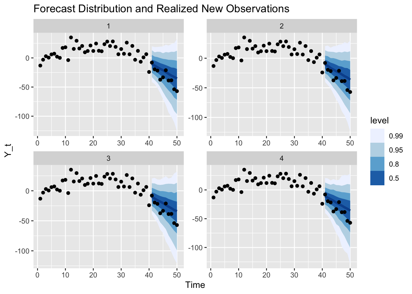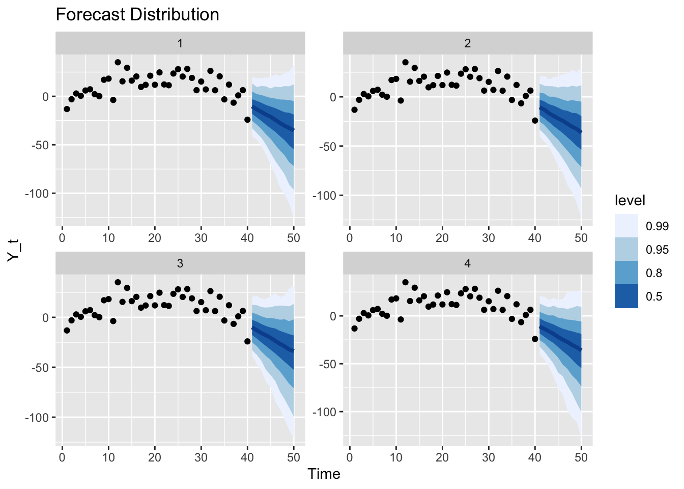 Finally, we can generate and graph the forecast of the time series from the estimated model for the next 10 time steps. Note that all the uncertainty from the parameters’ posterior distributions has been propagated into this forecast distribution.