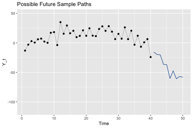These realized values are of course only one of many possible future outcomes: Had I chosen a different seed, we would have sampled different observations from the same model.