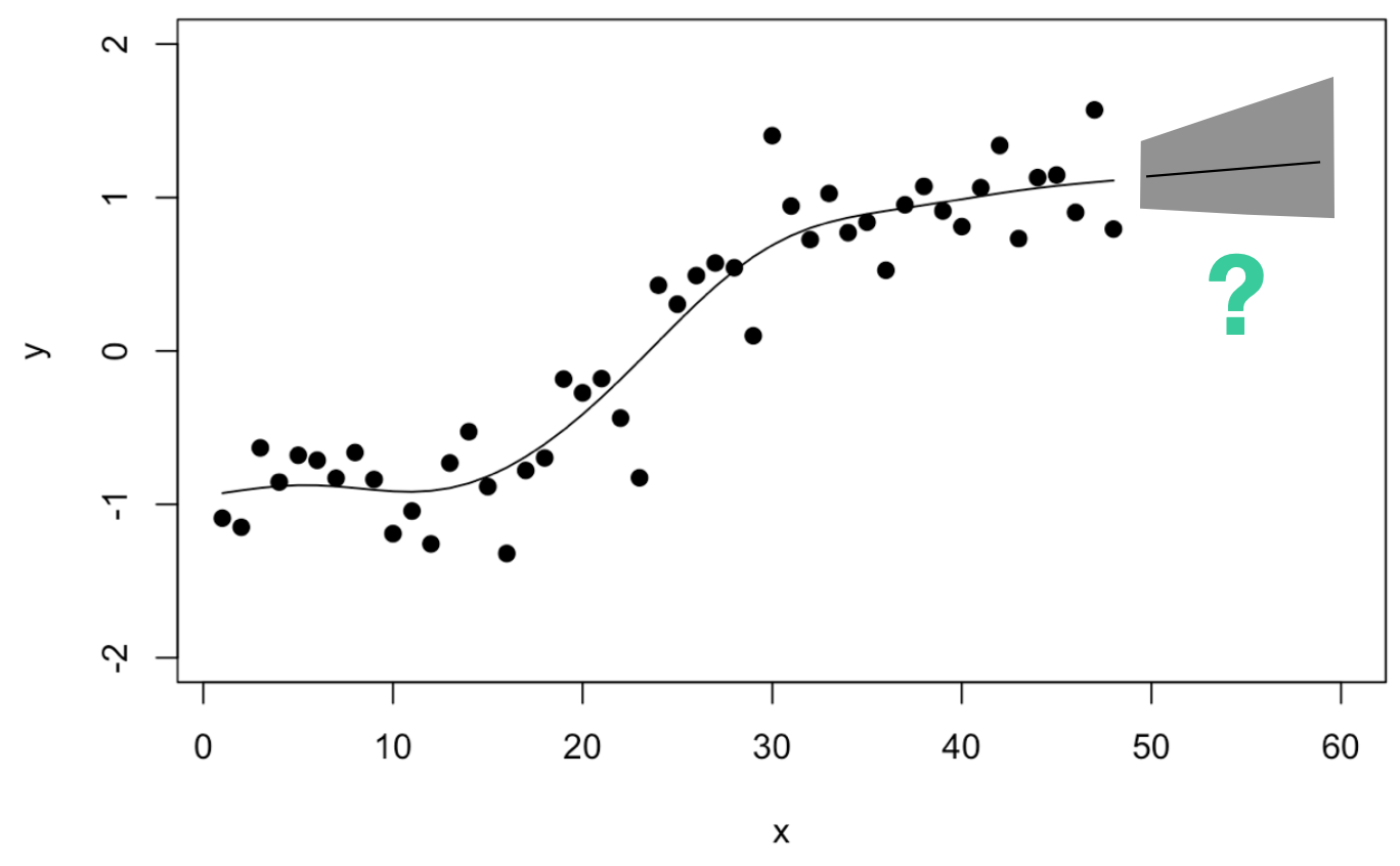 If you’re familiar with spline functions you know this isn’t a question I should have asked myself: When using splines, you are limited to predicting new data that falls into the domain of your training data, i.e. the domain on which the splines were fitted. Once you leave this domain, there are no fitted splines and so your model can’t predict. You can always make assumptions, of course: A linear continuation, using the last value, or similar. But what about your prediction interval?