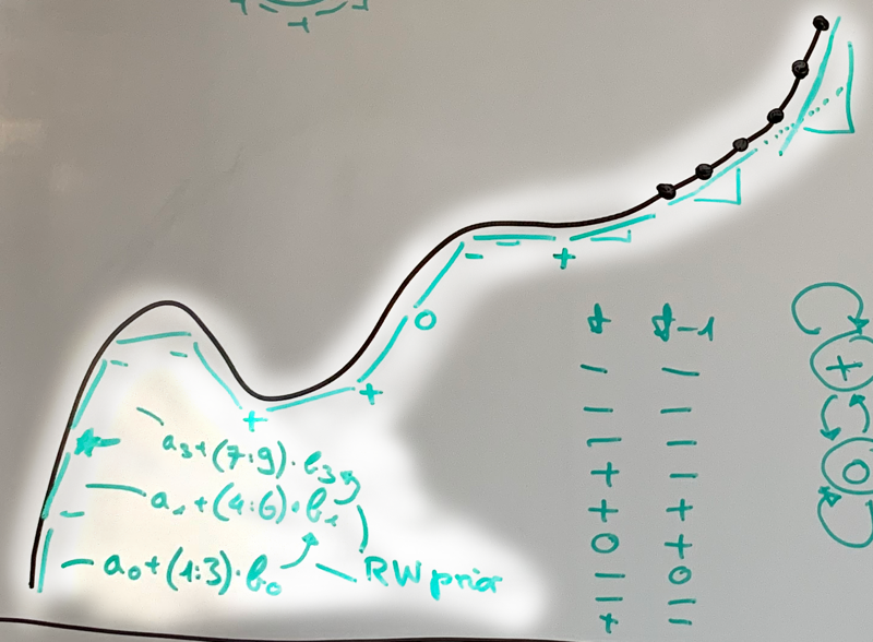 Don’t judge my drawing skills. I believe what I was trying to derive was some sort of local linear approximation to the smooth trend (you see the straight lines for every three observations). Each of the lines would be described by their own coefficients (see \(a_0, b_0, a_1, b_1, ...\) in the lower left corner). And to be fancy, I wrote Random Walk prior to describe how much a coefficient may change from one time point to the next. This is actually not much different from the formulation used in the prophet package: In my drawing, we have a potential changepoint every third observation and instead of changes drawn from a Normal distribution (random walk prior), prophet assumes the Laplace.