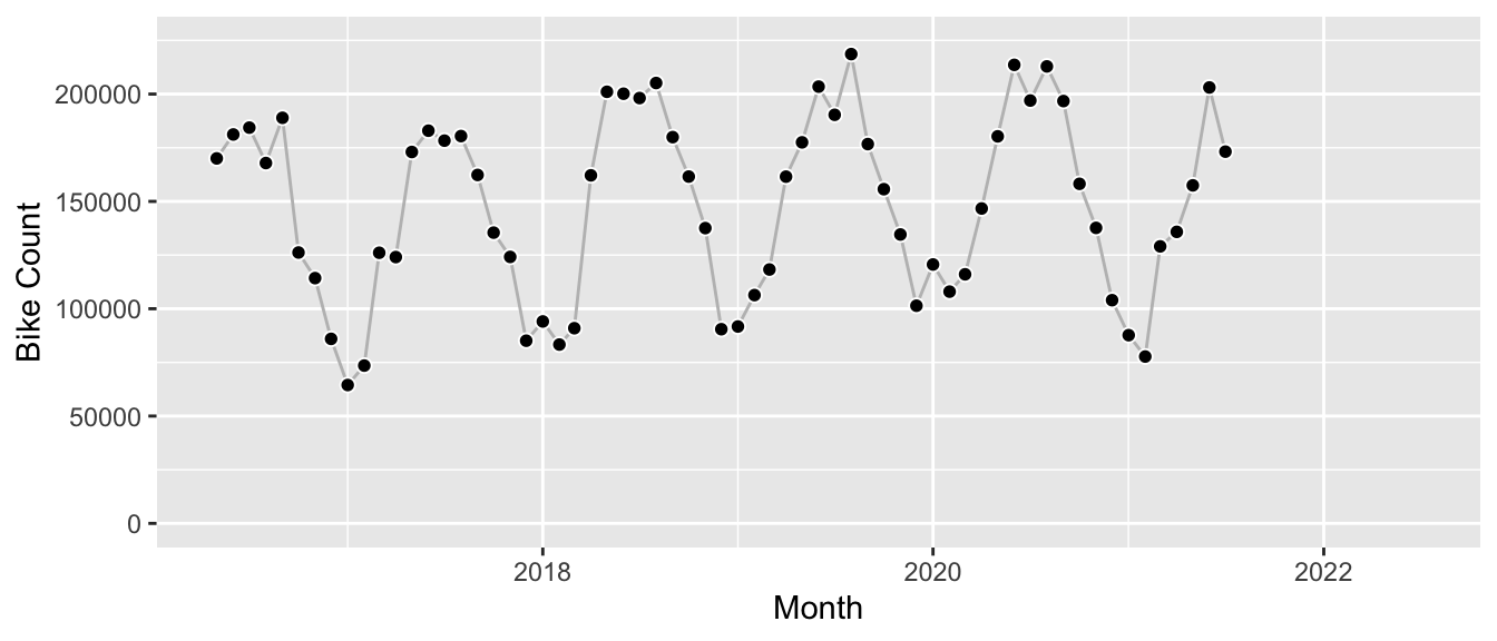 Let’s fit this model against monthly counts of bikes that passed the publicly available counter station at Maybachufer in Berlin; I aggregated the hourly data from the original dataset made available by the “Berlin Senatsverwaltung für Umwelt, Mobilität, Verbraucher- und Klimaschutz” on their website.1 It’s a smooth series of about five years history if we cut it off after June 2021 to keep a holdout year: