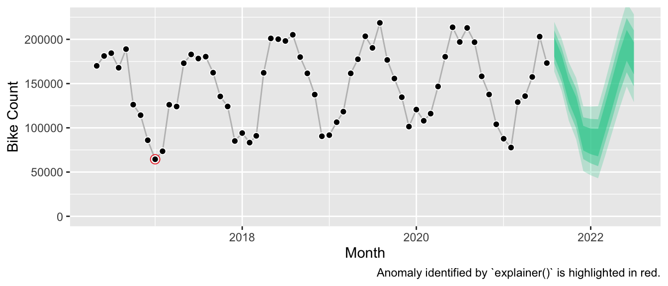 However, this allows us to play a bit with the information that is provided by the model object. Instead of purely interpreting the model parameters, one can expose how the model’s training (!) error compares to simple benchmarks like the seasonal naive method. If it compared unfavorably, this would presumably indicate that the model should not be relied upon. Similarly, the in-sample errors are used to identify potentially anomalous observations.4 Given the smooth bike counts, this isn’t as relevant here. But it could be valuable information to the user if a recent observation was unexpectedly large.