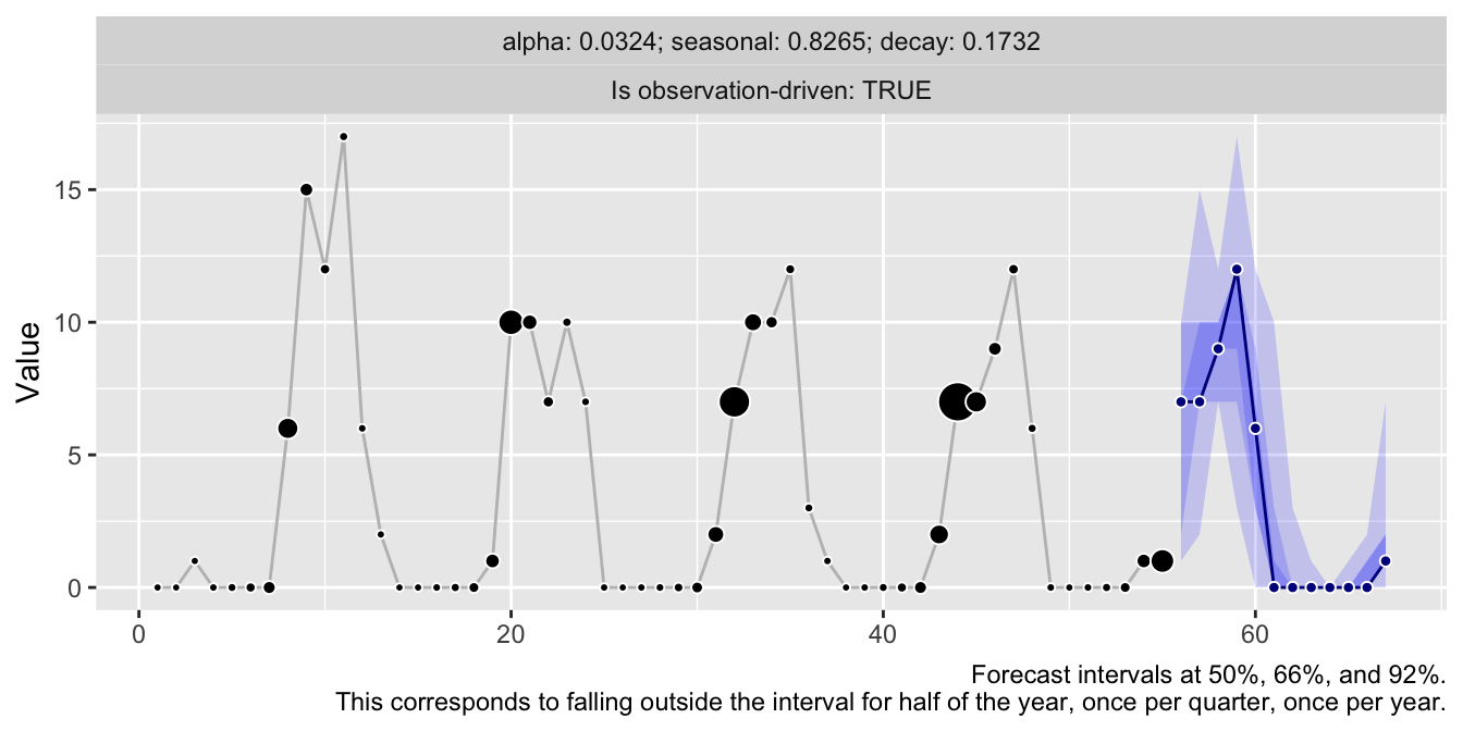 For example, instead of creating probabilistic sample paths from a parametric distribution fitted to residuals (as is usual for the simple forecast methods mentioned before, as well as ARIMA and ETS, but also DeepAR in a sense), sample paths can also be drawn as a non-parametric bootstrap from the weighted observations, which can be helpful for intermittent and low-count data. This has been described in Gasthaus (2016) and Alexandrov et al. (2019) for the Non-Parametric Time Series Forecaster (NPTS) that is also available in AWS Forecast and GluonTS. In fact, the NPTS model can be described by the \((\alpha, 0, 0)\) and \((0, 1, \alpha)\) model specifications, depending on whether the non-seasonal or seasonal version is used.